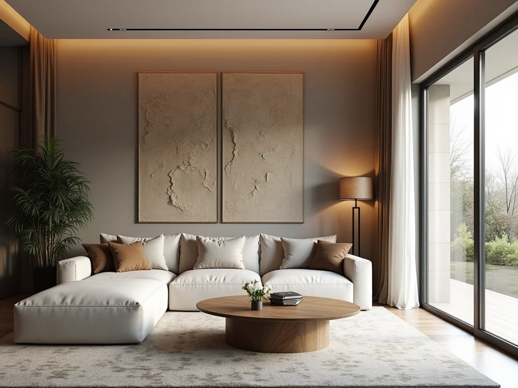 Cobogó de cerâmica artesanal em tom ocre, com relevos sutis, usado como painel decorativo em uma sala de estar, complementando mobiliário em tons terrosos e criando um ambiente aconchegante.