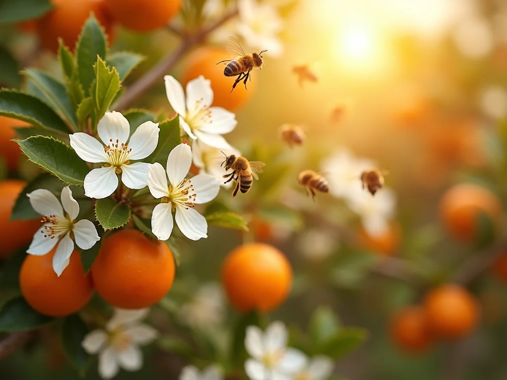 Dica Prática: Plante ervas como alecrim e tomilho, além de flores como girassol e lavanda, perto do seu laranjal. Elas atraem abelhas em diferentes épocas do ano.