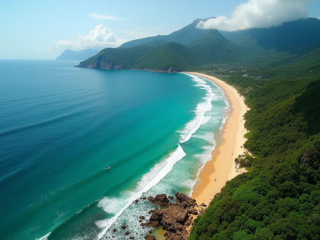 Vista panorâmica da Ilha do Cardoso, exibindo a densa vegetação verdejante contrastando com o azul claro do mar e a areia dourada.