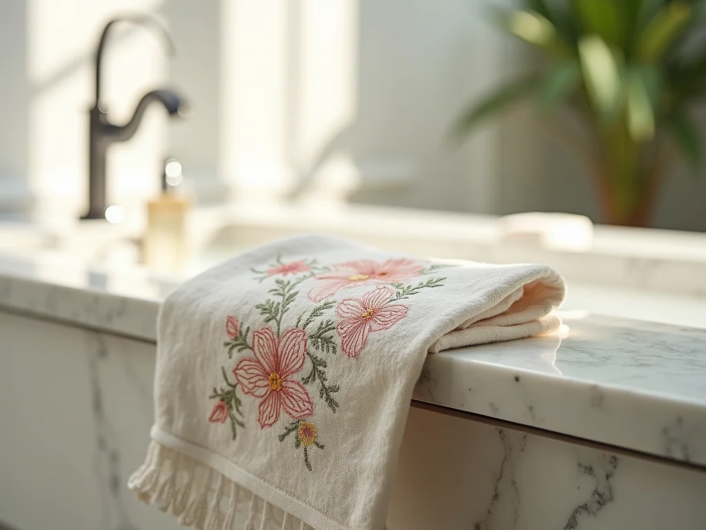Dica Prática: Ao escolher a sua toalha de lavabo bordada, opte por cores que complementem a sua bancada ou as paredes do lavabo. Um bordado em tom sobre tom ou um tom contrastante sutil funciona muito bem.
