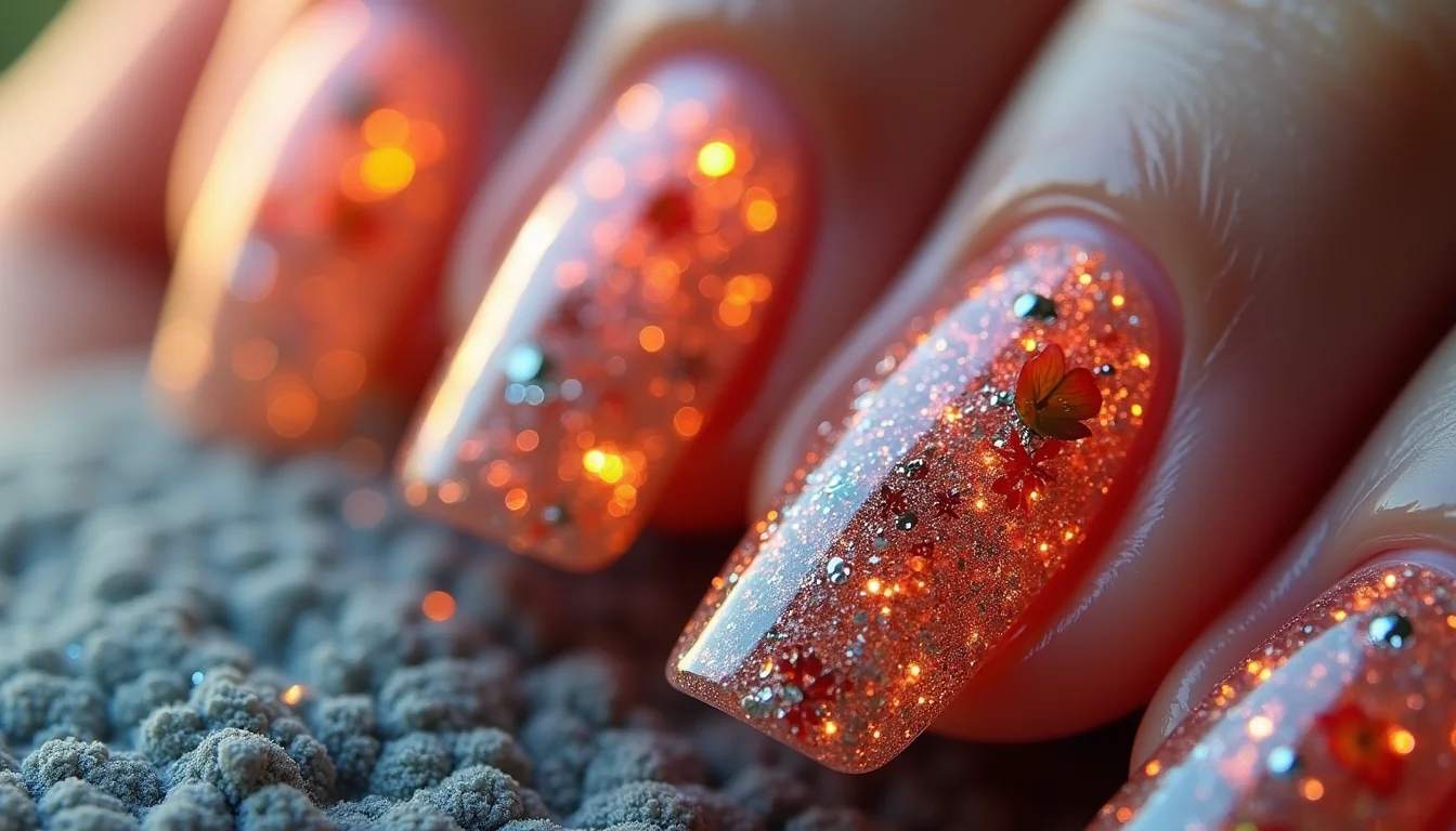 - Unhas com Glitter 3D: Elementos que criam relevo e textura dentro do encapsulamento.